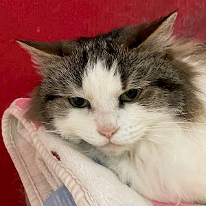 Catherine is an exceptionally beautiful long-haired tabby with a little pink nose and lips and long white whiskers. She does enjoy pets from humans, but we feel Catherine would do best in a quiet, adult-only home. Catherine will also need regular grooming to keep her long coat in great shape without tangles or mats.