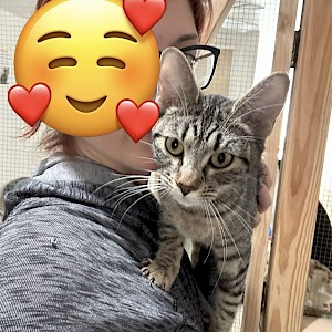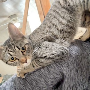 Chachi is a male brown mackerel tabby with golden eyes and the longest cat whiskers you’ve ever seen! Chachi is the perfect name for this feline for several reasons. Chachi wants to be and demands to be the center of attention. Ignore him and he’ll take matters into his only hands and jump up to cuddle on your shoulders. He loves human interactions and is very social and affectionate. Chachi is the smallest cat of this litter, but you’d never know it; his personality is as big as his namesake.