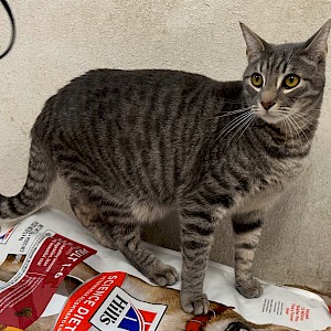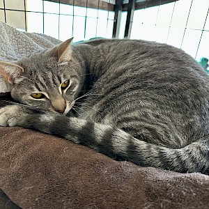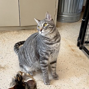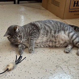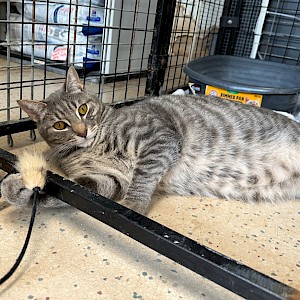 Dustin was very timid when he first arrived at AALOC, but the socialization provided by our volunteers has really made a difference in his demeanor. He still takes a bit of time to trust new people but once he has come around Dustin loves to play with wand toys and chase them. He’ll also brush along your legs and ask for pets. Dustin would do well in a quieter environment with someone who has the patience to allow him a little time to build a relationship with his new owner. Once he gets to know you Dustin is really an amazing cat!