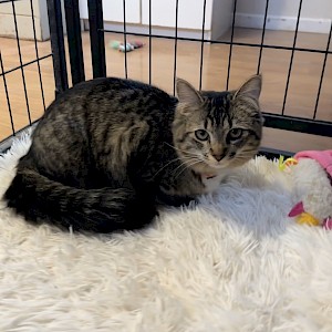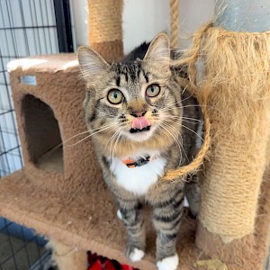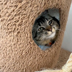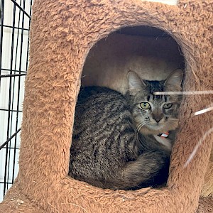 Greta Garbo is a female brown and black mackerel tabby. Greta can go both ways – she is very social with other cats and humans but just like her namesake, she also 'wants to be alone'… cuddled up in a cubby by herself. She particularly likes to play with her siblings – John Wayne, James Dean, Marilyn Monroe, Audrey Hepburn and Judy Garland. Greta can be adopted separately or pick two (or more!) from the litter for the most love and affection. You won’t ever be disappointed!