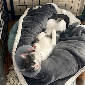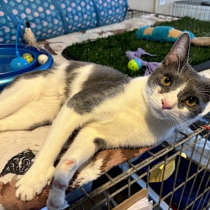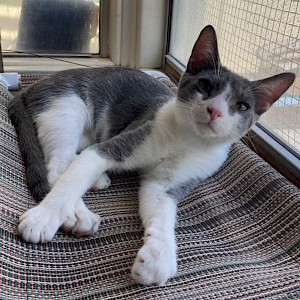 Jack couldn’t be any cuter or have a better personality, although he is a bit timid. The gray around Jack’s eyes looks a bit like the mask Batman wears and his pink button nose is framed in white. He’s precocious and playful and likes attention from the AALOC team. He’s grown a bit since he first arrived and has been neutered. Jack is now ready for a new home.
