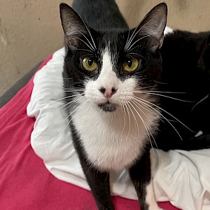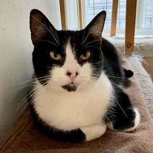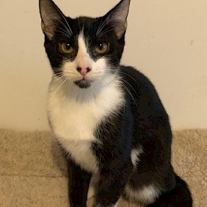 Joy is one of Faith’s two female kittens. A black and white tuxedo cat with a pink button nose, Joy is inquisitive and playful. Joy has exceptionally long whiskers and blue-grey eyes. Her coat is short in length, white in front and black in the back. She has four angel-white paws with little pink pads.