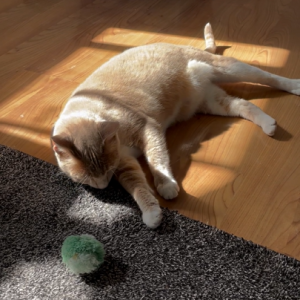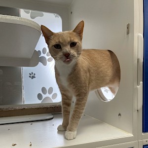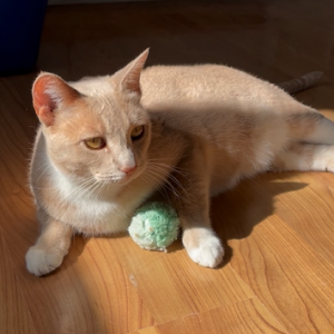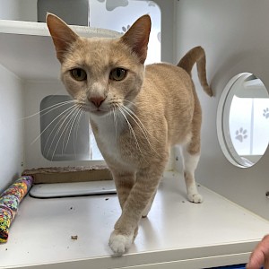 Kelly is a beautiful buff and white, short-haired tabby. She is friendly and playful. Although she thought a senior woman or man would be her perfect new owner, she is entirely open to being adopted into any family. She is such a sweet cat!