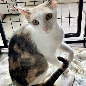 Lily is a stunningly beautiful calico cat. Her markings are quite unique: Lily has a pure white chest and front and back legs, but the rest of her body is a variegated calico color. She has a cute pink button nose and golden eyes. Lily is friendly but timid, and we feel she would do best in a quiet, adult-only home.