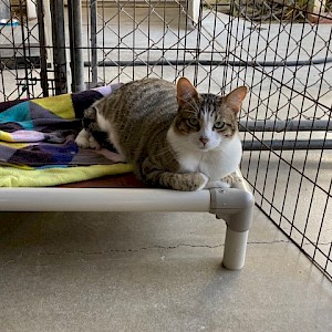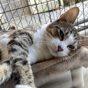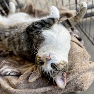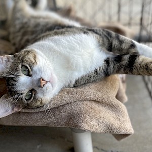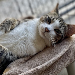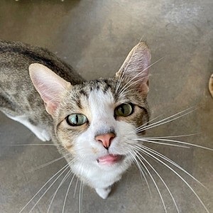 Marshall is a short-haired grey and white mackerel tabby. He is very curious and interested in meeting new people. He is also playful and smart. Marshall has magnificent whiskers and the cutest little pink button nose and lips.
