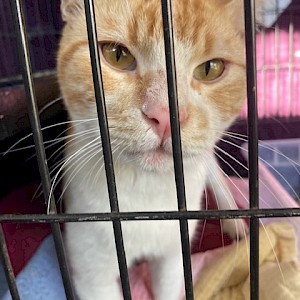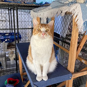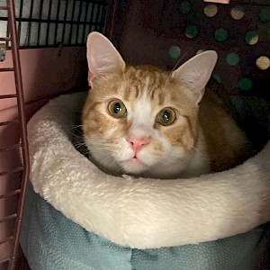 Mason is a short-haired orange and white mackerel tabby with golden eyes and a pink button nose. He’s a sweet cat that enjoys attention and gets along very well with his other brothers. As a rule, orange tabbies are the epitome of “couch potatoes,” exhibiting as little energy as possible and making comfort their sole mission. In fact, many owners of orange tabbies will fully admit that their cats are just plain lazy. Given that orange tabbies also enjoy eating (think of cartoon cat Garfield), it is important that their weight is regularly monitored and maintained so as not to get too large. The upside of this proclivity is that orange tabbies make great lap buddies and cuddlers.