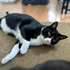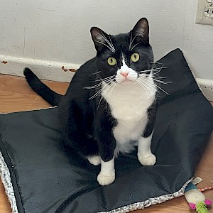 Paul is a black and white tuxedo cat. He is a very handsome feline, just like his namesake. Paul’s pink nose is a bit big for his face, giving him an interesting look that matches his personality. White socks on all four paws and a snowy white belly complete his appearance.