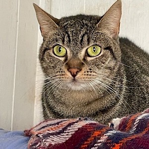 Piper is a feral, brown mackerel tabby cat that was trapped in front of the kennel as a kitten. Although captured at an early age, Piper will still need to be adopted by an extremely patient individual who is experienced with working with feral cats: someone interested in putting in the effort and time to build a relationship with a feline that does not trust humans.