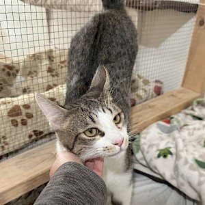 Richie is an adorable fellow that loves to be held and petted; he’s super friendly. He has a fascination with mobile phones and is very curious about how they work, so he might also be the “techie” one of the litter. Mackerel tabbies come in all colors, but Richie is particularly handsome with his broad white chest and paws. He looks a like Fonzy but for the two brown marks on either side of his nose.