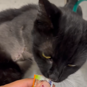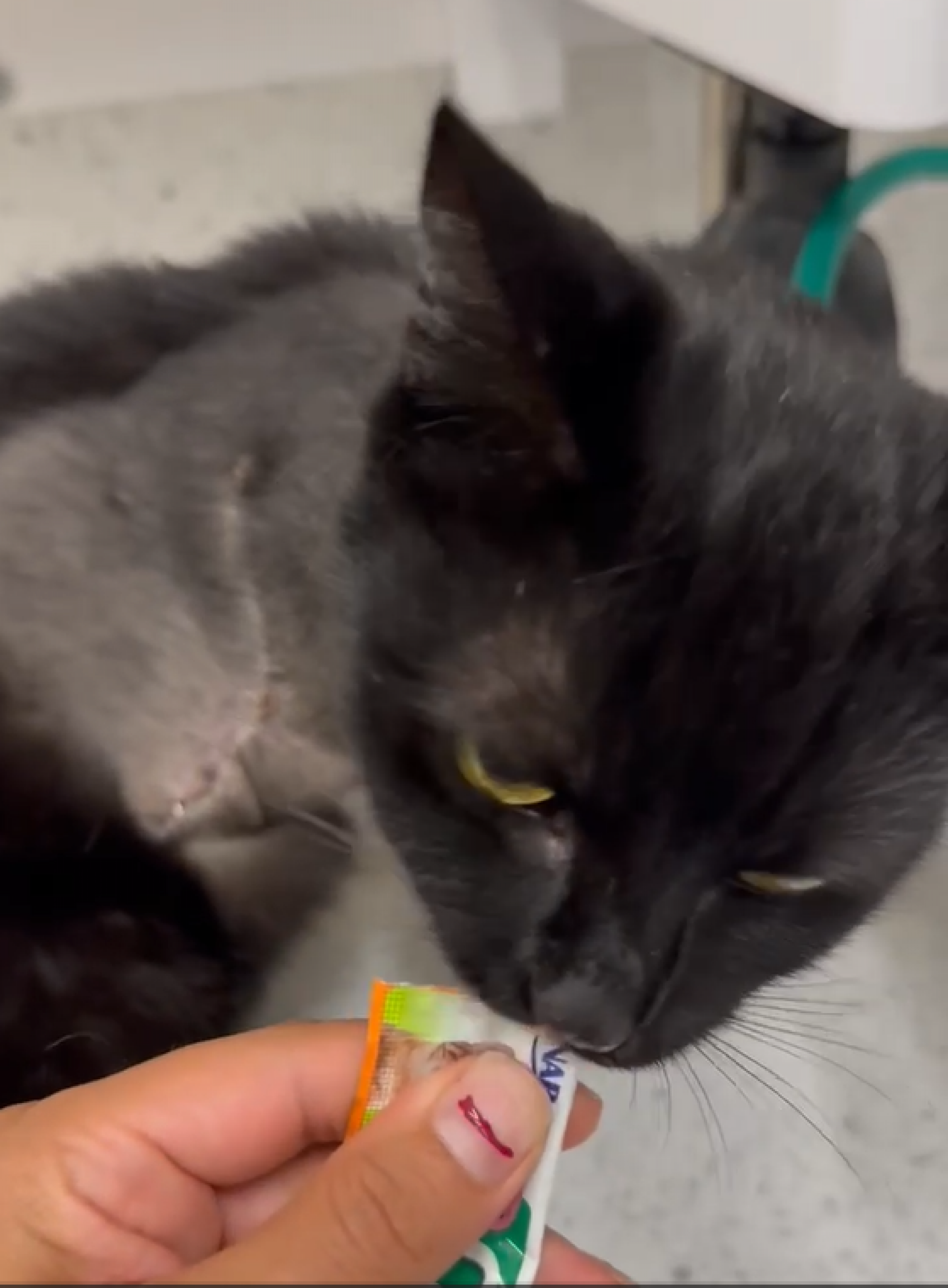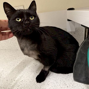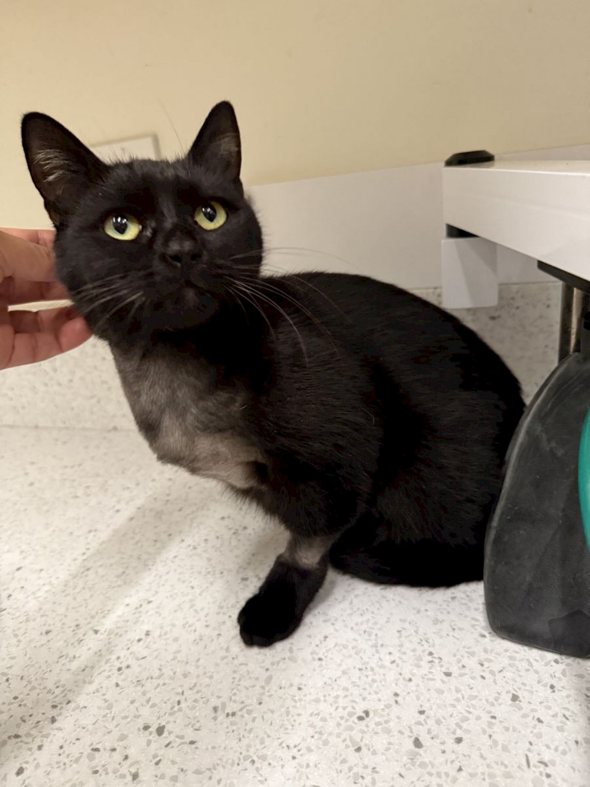 Shadow, a very sweet tiny all black cat came to the ER after someone shot her in Santa Ana. Her leg was shattered and could not be saved. The ER called AALOC and said they would discount the amputation surgery by 50% if we could help. We agreed to pay half if another OC group matched us and paid half - and they did. After surgery Shadow was relinquished to AALOC and fostered by a vet tech at the ER who made sure Shadow was fully recovered. Shadow is now ready to be adopted into a safe and loving home. Shadow has no special needs, is fully mobile and surprisingly active.