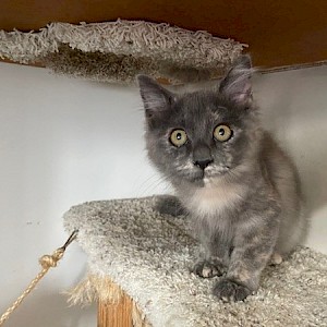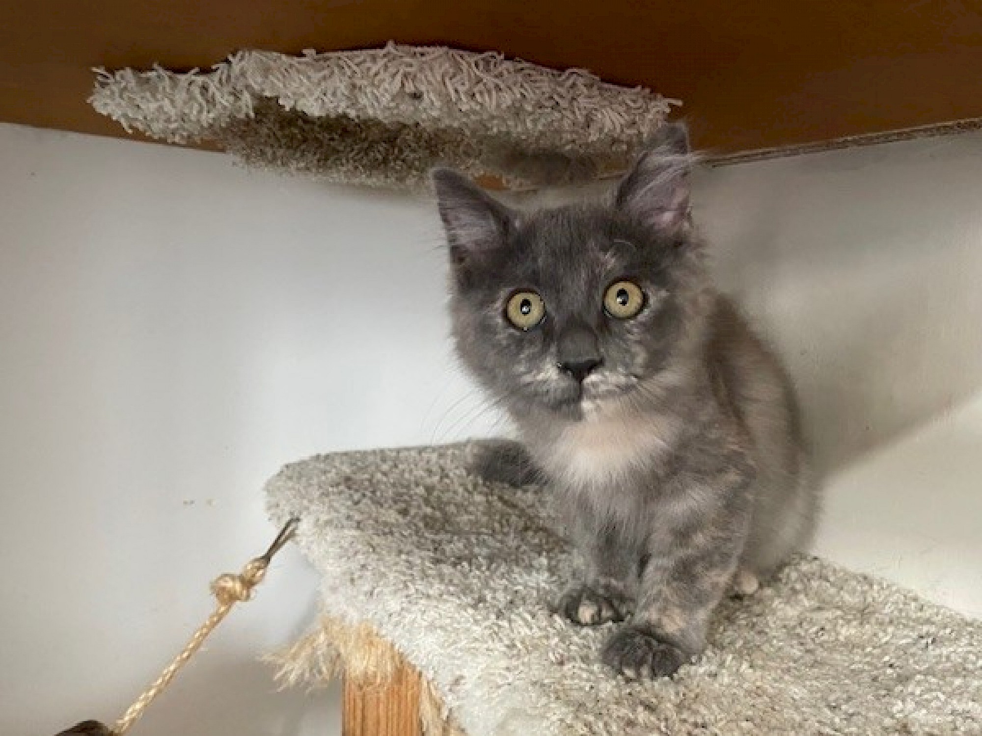 This sweet, medium-haired tabby looks like she could be part calico, part tuxedo and part just plain cute! A bushy tail that goes on forever, golden eyes and a black button nose complete her selfie-ready appearance. Spend just a minute playing with Talulah and you will be smitten with this little elf of a kitty.