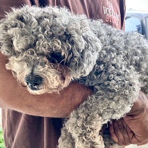 Ranger is a small, adult male poodle mix. Ranger was quiet and seemed sad when he arrived, but without hesitation Ranger allowed the AALOC team to cuddle him. Ranger’s hair is curly and his coat will need to be cut and groomed regularly.