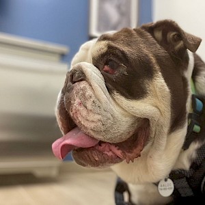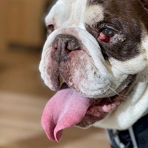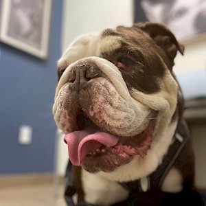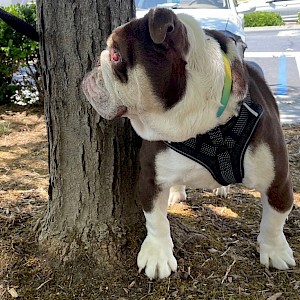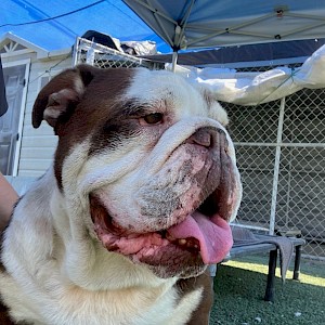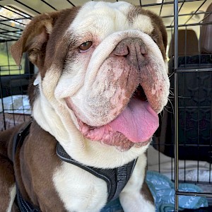 Bulldogs are brachycephalic dogs: breeds characterized by their shortened skulls and flattened faces. They can overheat and over-exert themselves very quickly. A harness must always be used instead of a leash attached to a collar for risk of tracheal collapse. Because of these special needs, an adopter who has experience with brachycephalic dogs is preferred.