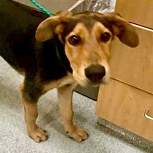 Snoopy is a 5-month-old hound shepherd mix who was brought to another Orange County shelter as a stray, but the "finder" called later to admit that he was the owner. When the shelter informed the owner that his dog tested positive for parvo, he said he could not handle taking care of that and the shelter was unable to make further contact with him.