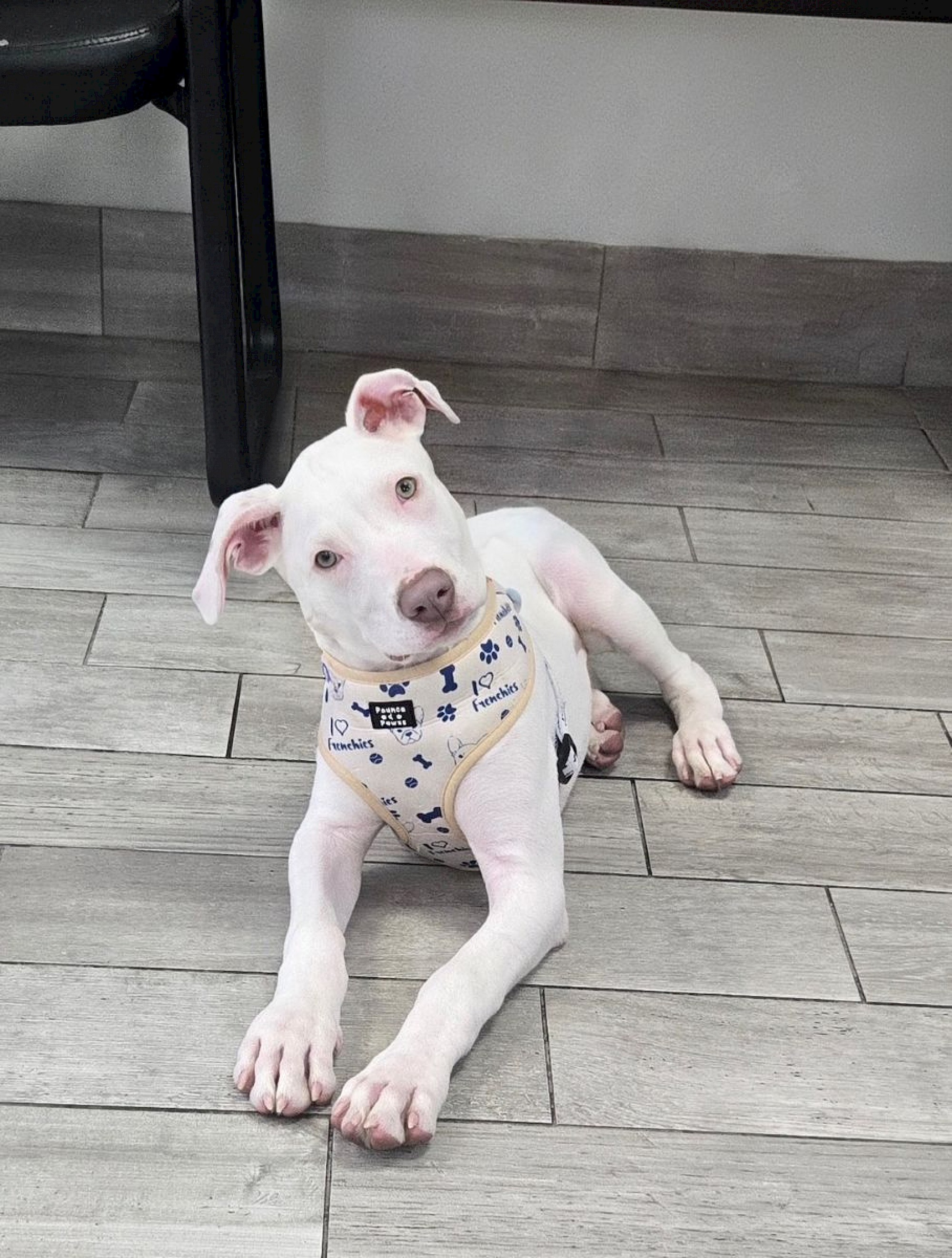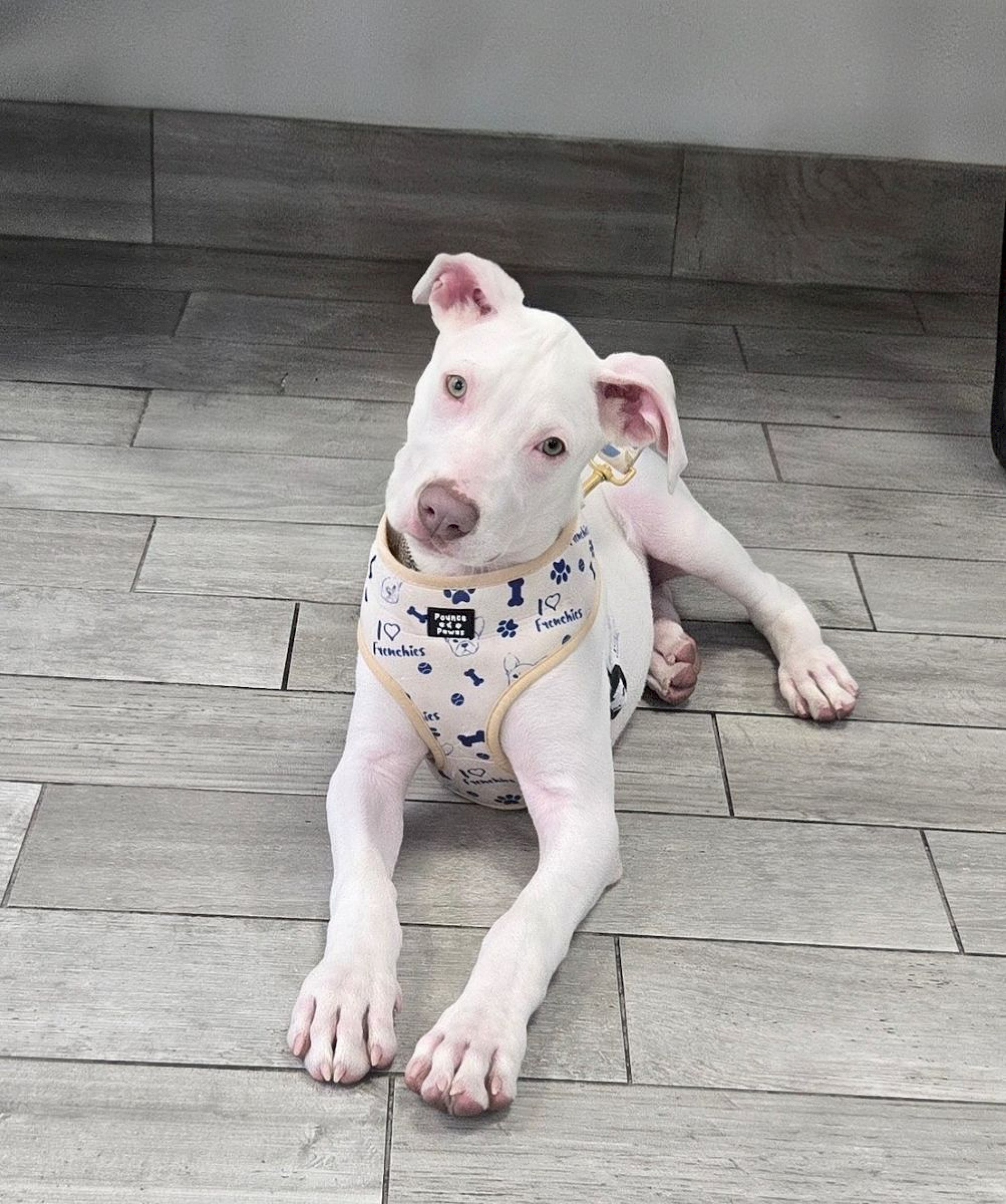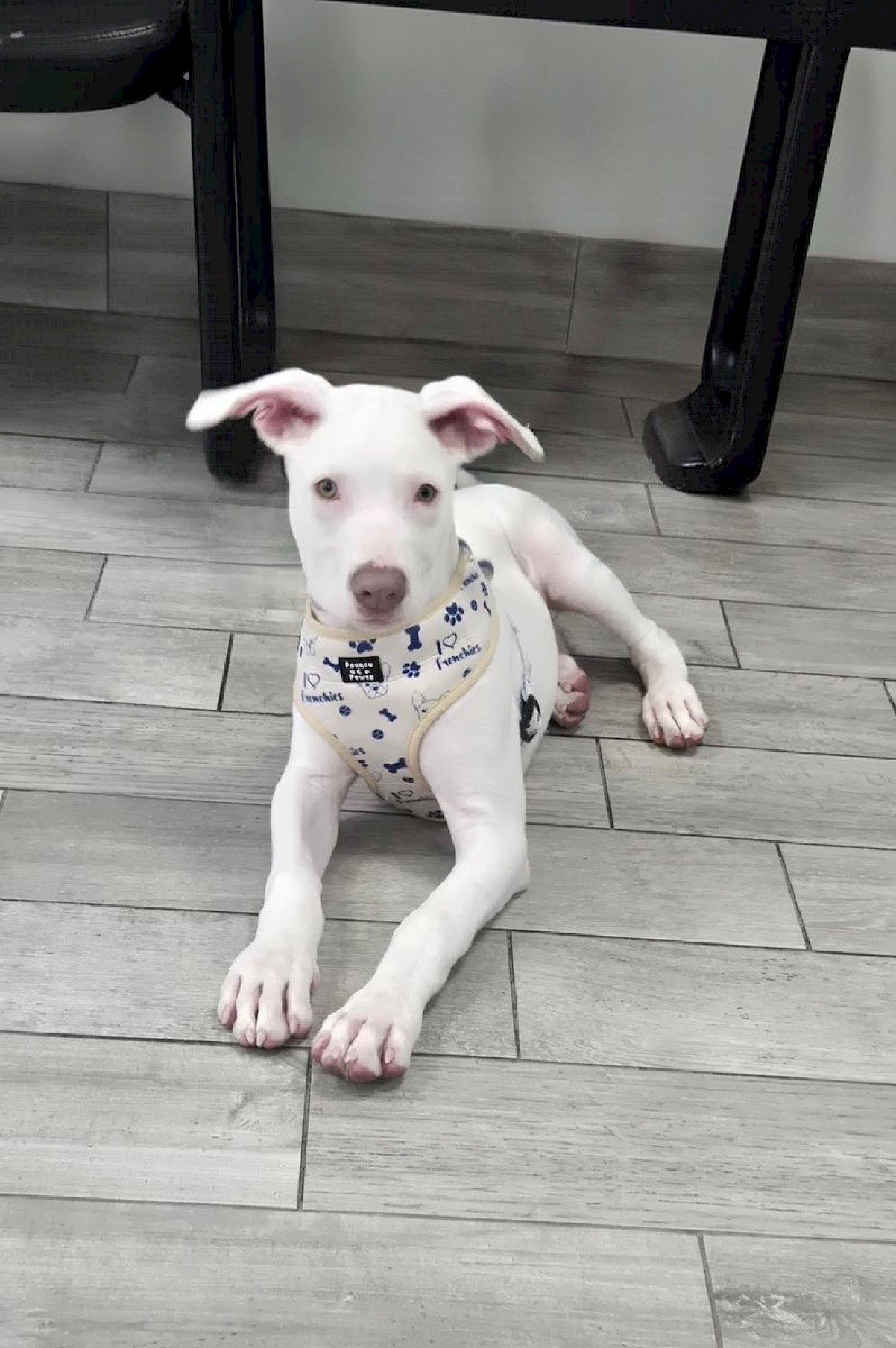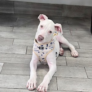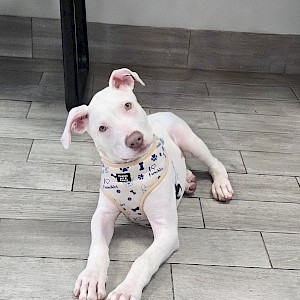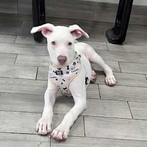 Spencer is a striking all-white puppy with soft grey-green eyes and what might just be the waggiest tail you’ll ever see. He’s everything you’d hope for in a young pup—playful, affectionate, curious, and full of joyful energy. Whether he’s exploring the world around him or soaking up attention, Spencer brings a lightness and love that’s impossible to resist.