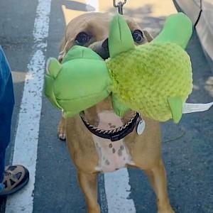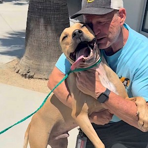 Trooper was at the Orange County Animal Care Center since April 2024. He attended all of the public adoption events and quickly became a volunteer favorite! So, it came as quite a shock when 14 months later, he was involved in a bite incident with a stranger on the shelter property which led to him being removed as available for public adoption. His only hope was to be rescued, and AALOC stepped forward to help him. The AALOC team was able to scoop up Trooper in the nick of time. When we arrived to take Trooper to our humane center, numerous Orange County Animal Care volunteers came to give Trooper the send-off he deserved, with love and best wishes as he left for his new rescue home.